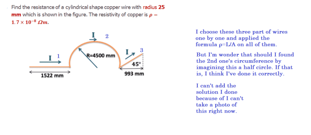 - Participants discuss the formula for resistance and question the shape of the wire, particularly the identification of a semicircular section. There is also a focus on clarifying the dimensions mentioned in the problem.