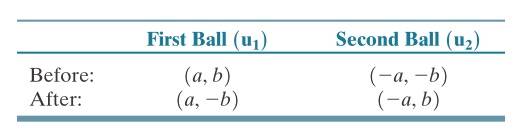 First, please, zoom in the attached file and take a look on it. Image 1 demonstrates the situation: two identical balls collide, horizontal component of velocity of both remains unchanged and vertical component becomes opposite as a result of the collision. Table in image 3 shows all the velocities in terms of a (horizontal component) and b (vertical).