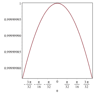 [itex]\displaystyle {\it plot} \left( \left( \left( \left( \cos \left( 0.0009929180323\\<br /> \mbox{}\,\sin \left( \theta \right) \right) \right) ^{2} \right) \left( 2014.264960\,{\frac {\sin \left( 0.0004964590161\\<br /> \mbox{}\,\sin \left( \theta \right) \right) }{\sin \left( \theta \right) }} \right) \right) ^{2},\theta={{\it convert} \left( -20\\<br /> \mbox{}\,{\it degrees},{\it radians} \right) \ldots {\it convert} \left( 20\,{\it degrees},{\it radians} \right) }\\<br /> \mbox{},{\it axes}={\it boxed} \right)[/itex]Yields this: