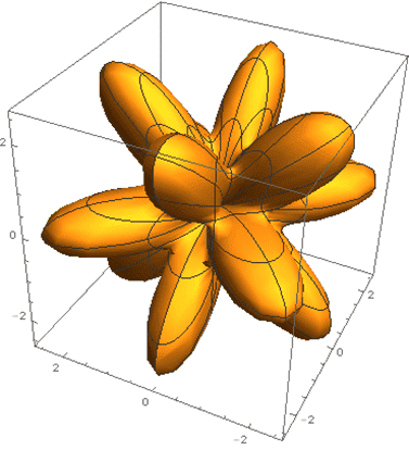 Using this approach I attempted to produce a plot showing the time-averaged power radiated in different directions. For the "cube" octupole I get the following surface. (If you pick a point on the surface, the power radiated in the direction from the origin to that point is proportional to the distance of the point from the origin.) So, the power is mostly radiated into 4 "upper" lobes, 4 "lower" lobes, and 4 "horizontal" lobes. The lobes point toward the midpoints of the edges of the cube.