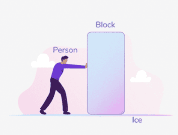 The figure presents a person pushing a large block toward the right. The block is slightly larger than the person. The person and the block are both on a horizontal surface labeled Ice.