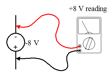 So the negative voltage just mean that the positive terminal is 8V less than the negative terminal and therefore the positive charge wants to flow to the positive terminal. Right?