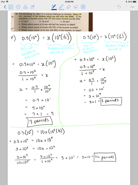You’re testing the effect of a noxious substance on bacteria. Every 10 minutes, one-tenth of the bacteria which are still alive are killed. If the population of bacteria starts with 10^6, within which period of 10 minutes will 70% of the bacteria be killed?