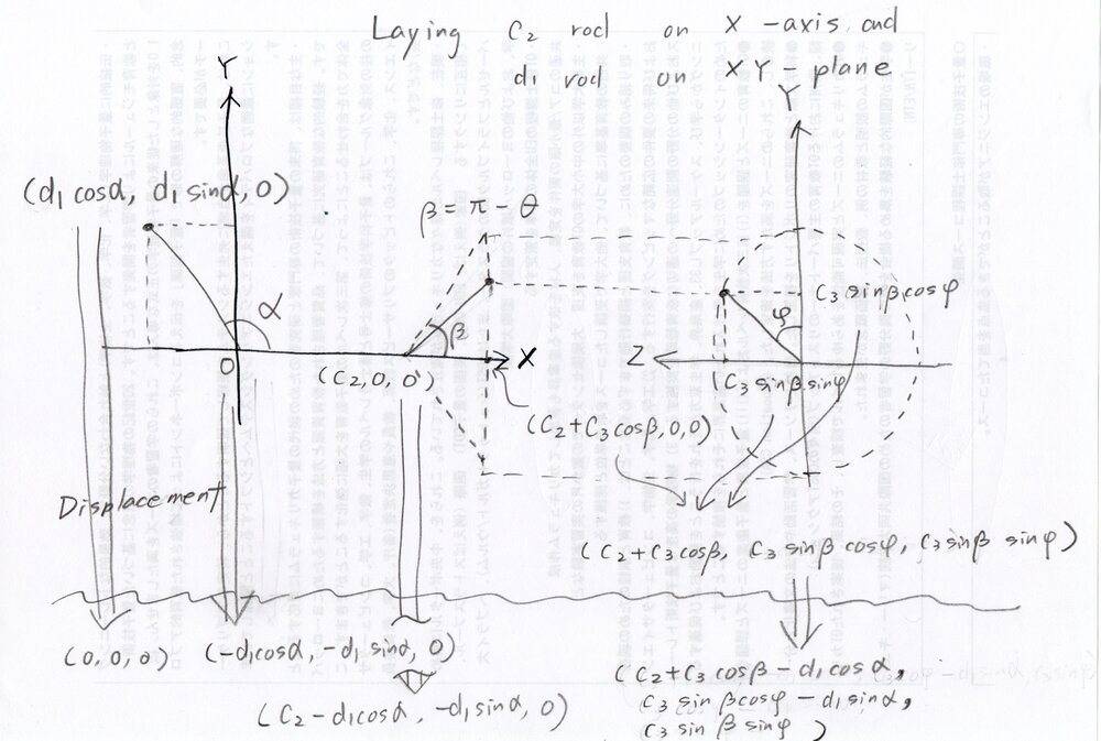 - II is coaxial with a axis and free to rotate around c axis. There a fixed angle θ between a and c axis. Length d2