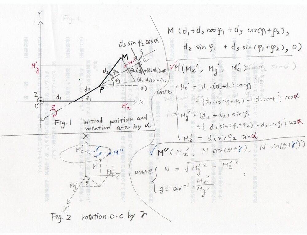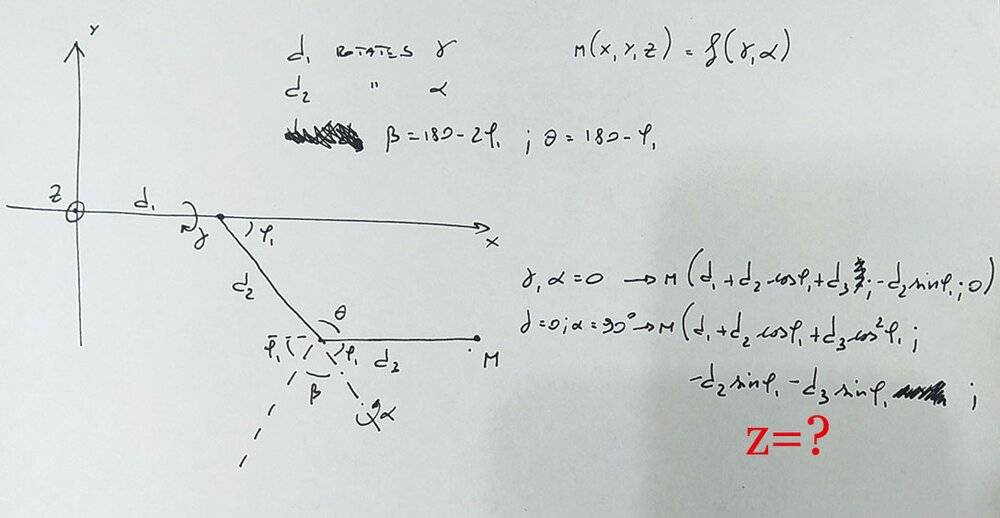 I'd like to find a relation between position of point M in function of angles: so ##M(x,y,z)=f(\alpha, \gamma)## where ##\alpha = a_{axis}## angular position and ##\gamma = c_{axis}## angular position, ##0 \leq \gamma, \alpha \lt 360 ° ##