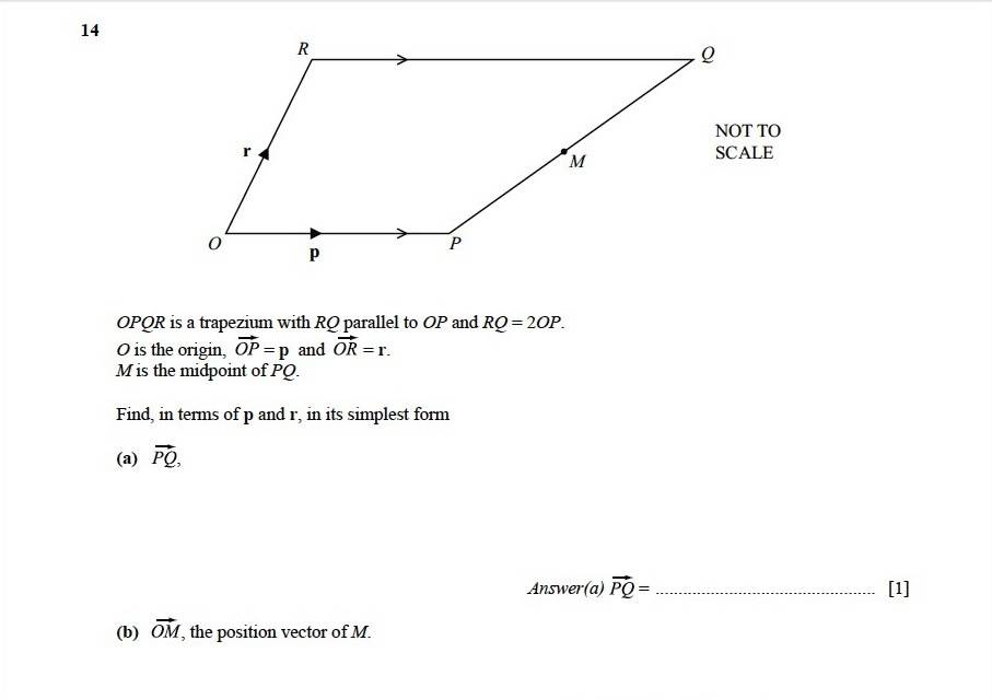 The discussion centers on solving position vector equations involving points P, Q, O, R, and M. The key equations provided are $\vec{PQ} = \vec{PO} + \vec{OR} + \vec{RQ}$ and $\vec{OM} = \vec{OP} + \frac{1}{2}\vec{PQ}$. Participants emphasize the importance of breaking down the vectors into their components and applying vector addition principles to derive the final expressions. The conversation concludes with a clear method for manipulating these vectors to achieve the desired results.