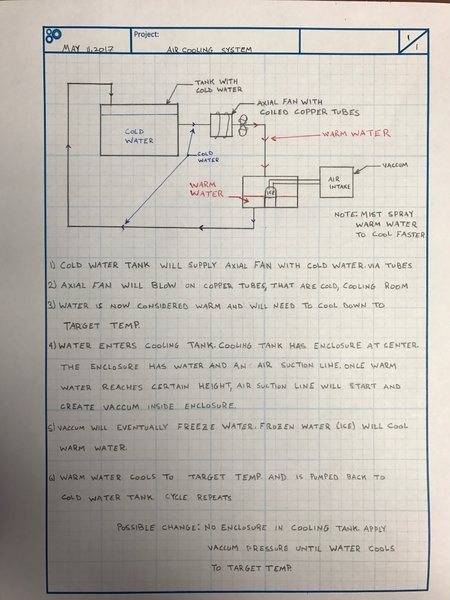 Summer is coming and instead of buying a $200-$400 air conditioner, I'd figure I could try a DIY version. I came up with a schematic (attached below) and how I think it would work. I feel like I'm missing something blatantly obvious that will make it not feasible. Wondering if you could take a look and give me some pointers?