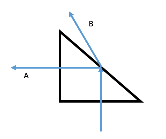We are trying to think through this but we keep hitting mental blocks. We know that a and b have different wavelengths, and that both of the wavelengths will change by the same factor when they enter the glass. We also know that you will get total internal reflection (TIR) at some angle specified by the indices of refraction for the glass prism and air.