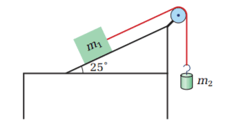 In the diagram, m1 has a mass of 47 kg and m2 has a mass of 35 kg. The coefficients of friction between m1 and the surface of the inclined plane are µs = 0.42 and µk = 0.19.