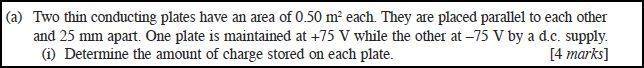 1) "One plate is maintained at +75 V while the other at -75 V by a d.c. supply" means? Does it means that this capacitor is connected to a 150 V d.c. supply or just a 75 V?