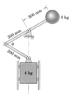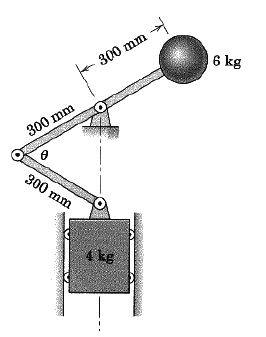 The mechanism in the attached photo contains two masses, each treated as particles. When released from rest, the 4-kg block falls and the 6-kg sphere rises. Initially, the angle between the two rigid, massless linkages is θ = 60°
