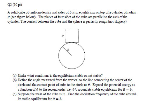 I know that the potential energy is just the gravitational potential energy, which is mgh(𝜃) = mg[(R+b/2)cos𝜃 +R𝜃sin𝜃], derived from the geometry. The equilibrium point is at 𝜃=0 and the system is a stable equilibrium for R>b/2. However, I have no idea how I can convert the potential energy as a function of the square of 𝜃, as stated by the question.