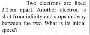- Two electrons are fixed 2.0 cm apart. Another electron is shot from infinity and stops midway