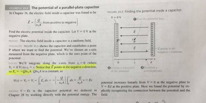 The discussion centers on the electric field (E) of a parallel plate capacitor, specifically the equation E = -Q/(ε0A). The negative sign indicates the direction of the electric field vector, which points from the positive plate to the negative plate. When the orientation of the capacitor is reversed, the electric field direction changes, resulting in a positive x-component. This clarification helps in understanding the relationship between charge distribution and electric field direction in capacitors.