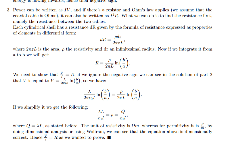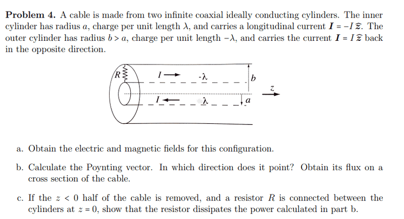 The discussion focuses on calculating the power dissipated by a resistor connected between two cylinders in a coaxial cable setup. The key point is that for any resistance value R, the power dissipation must equal the rate of electromagnetic field energy propagation, determined using the Poynting vector from part (b). The relationship between voltage (V), current (I), and resistance (R) is established through Ohm's Law (V = IR), emphasizing the need for specific values of λ (wavelength) and I (current) to satisfy this equation. The problem is noted as poorly stated, leading to confusion among participants.