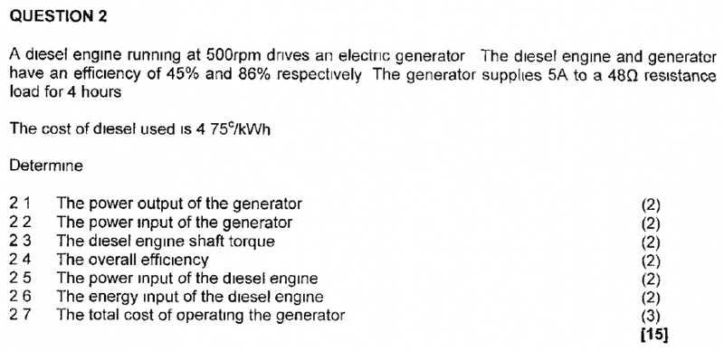- Participants attempt various calculations using equations for power and efficiency, questioning the validity of their results. There are discussions about the small torque output of a diesel engine and the relationship between power input and output. Questions arise regarding the derived units for watts and the use of hours in calculations.