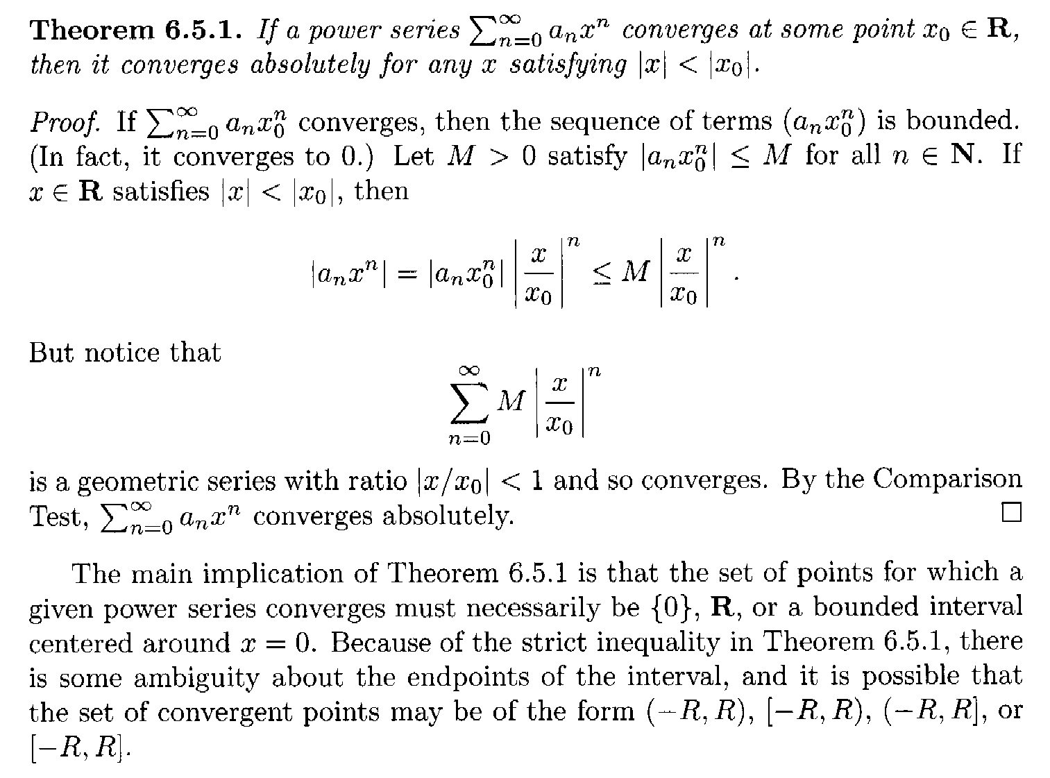 " ... ... The main implication of Theorem 6.5.1 is that the set of points for which a given power series converges must necessarily be $$\{ 0 \} , \mathbb{R} $$, or a bounded interval centred around $$x = 0$$ ... ... "I was wondering why the above quote would be true ...