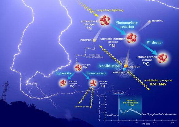 I read this article Lightning Strikes Produce Antimatter Particles in Earth’s Atmosphere which I find very intriguing and it raises many questions for me, so I will try to contain myself. Here is the accompanying illustration: