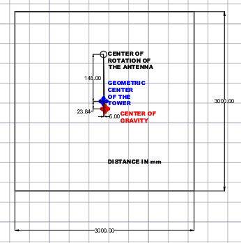 2- After the antenna is fixed to a pedestal in the top of the tower (45 m) the centre of gravity of the whole structure (tower + antenna) is about 5 mm in the xx direction, and 23.84 mm, the centre of rotation of the antena is 148 mm in the yy direction (see scheme).