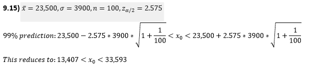A random sample of 100 automobile owners in the state of Virginia shows that an automobile is driven on average 23,500 kilometers per year with a standard deviation of 3900 kilometers. Assume the distribution of the measurements to be approximately normal. Construct a 99% prediction interval for the kilometers traveled annually by an automobile owner in Virginia.