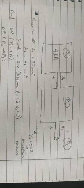 I'm trying to estimate the pressure in the cavity, i.e. P2. I know the areas, A1 which in practicality is an annulus and A2 which is a 600m pipe with i/d 8mm.