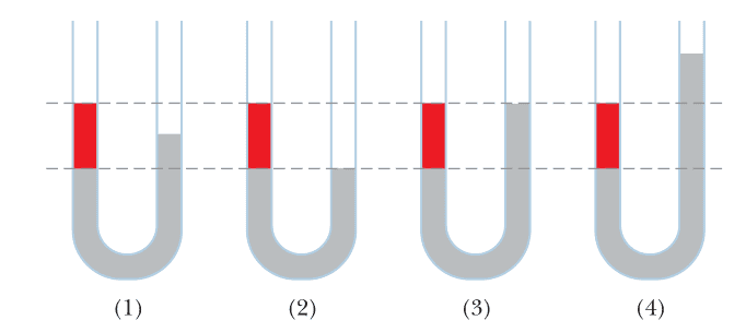 - The figure below shows four situations in which a red liquid and a gray liquid are in a U-tube. In one situation the liquids cannot be in static equilibrium. (a) Which situation is that? (b) For the other three situations, assume static equilibrium. For each of them, is the density of the red liquid greater than, less than, or equal to the density of the gray liquid?