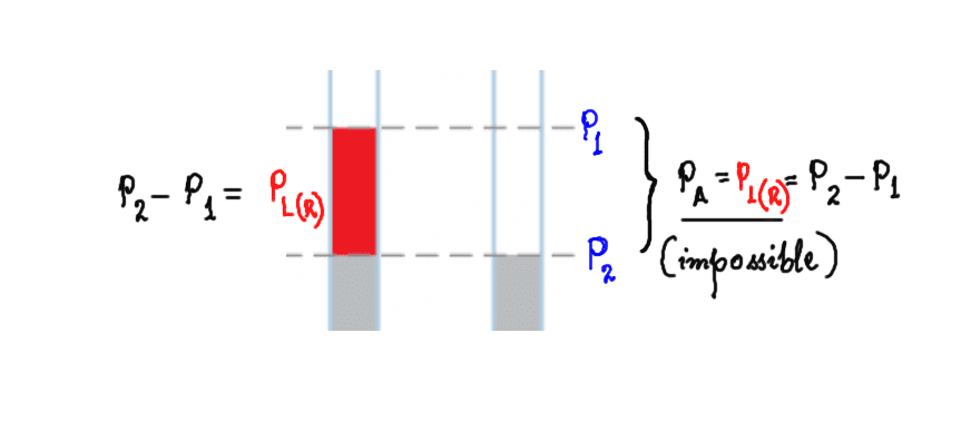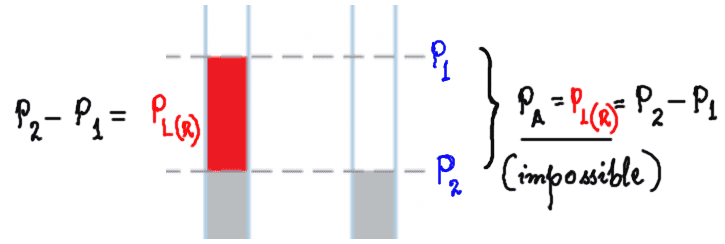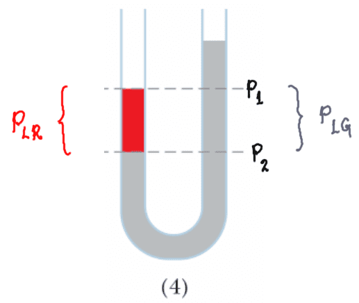 Arguments are the same as before, focussing on equality of pressure ##P_2## on both sides which imply again that ##\color{red}{P_{LR}} = \color{grey}{ P_{LG}}##. But in this case since the liquid colums have the same heights, we conclude that ##\boxed{\color{red} {\rho_{LR}} = \color{grey}{\rho_{LG}}}##.Situation 4 is shown alongside.