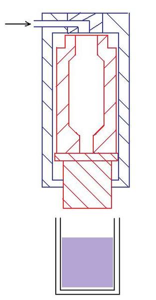 Hydraulic fluid is pumped into the Press Cylinder (Shown in Blue) forcing the Piston/Ram (shown in Red) down into another Cylinder (Shown in Black) that holds 10kg of a soft plastic. The soft plastic is then extruded through a die at the bottom of the cylinder.
