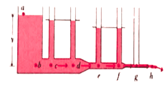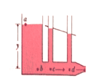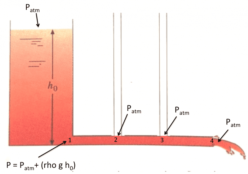The ideal fluid moves at constant speed along the horizontal pipe. Because the fluid is ideal (zero viscosity), the ideal fluid will reach zero height inside any of the vertical piezometers. Why? I know there is no pressure drop along the horizontal pipe since the viscosity is zero.