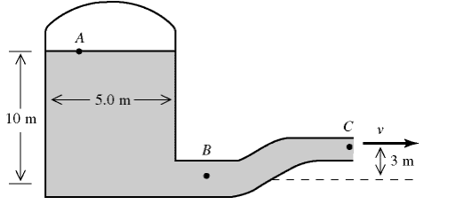 A pressurized cylindrical tank, 5m in diameter, contains water which emerges from the pipe at point C with a velocity of 25 m/s. Point A is 10m above point B and point C is 3m above point B. The area of the pipe at point B is 0.07 m2 and the pipe narrows to an area of 0.02m2 at Point C. Assume the water is an ideal fluid in laminar flow. The density of water 1000kg/m3