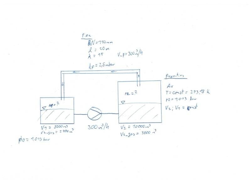 Now I assume that when the pump starts the pressure p2 in vessel 2 will equal the pressure loss within the pipe plus p0. I use the ideal gas law to calculate the mass of the air within vessel 2 at the pressure p0 and p0+dp. I calculate the difference between the mass at p0 and p0+dp and substract it from the mass in vessel 1. Now I calculate the pressure in vessel 1 with the calculated mass.