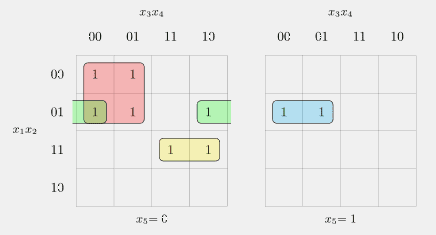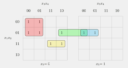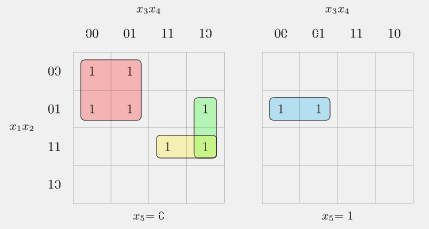 \begin{align*}f(x_1, x_2, x_3, x_4, x_5)&=x_1^0x_2^0x_3^0x_4^0x_5^0\lor x_1^0x_2^1x_3^0x_4^0x_5^0\lor x_1^0x_2^0x_3^0x_4^0x_5^1\lor x_1^0x_2^1x_3^0x_4^1x_5^0 \\ & \lor x_1^0x_2^1x_3^0x_4^0x_5^1 \lor x_1^1x_2^1x_3^0x_4^1x_5^0\lor x_1^0x_2^1x_3^1x_4^1x_5^0\lor x_1^0x_2^1x_3^1x_4^1x_5^1 \\ & \lor x_1^1x_2^1x_3^0x_4^1x_5^1\end{align*}