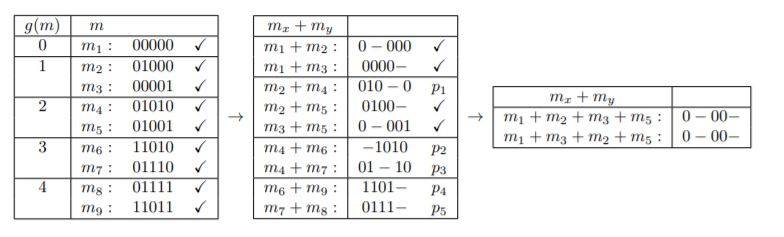 \begin{align*}&p_1=m_2+m_4=x_1^0x_2^1x_3^0x_5^0=\bar{x}_1x_2\bar{x}_3\bar{x}_5 \\ &p_2=m_4+m_6=x_2\bar{x}_3x_4\bar{x}_5 \\ &p_3=m_4+m_7=\bar{x}_1x_2x_4\bar{x}_5 \\ &p_4=m_6+m_9=x_1x_2\bar{x}_3x_4 \\ &p_5=m_7+m_8=\bar{x}_1x_2x_3x_4 \\ &p_6=m_1+m_2+m_3+m_5=\bar{x}_1\bar{x}_3\bar{x}_4\end{align*} The primterm table is then the following: