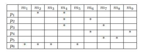 We can delete the columns $m_2, m_3, m_5$ because of $m_1$. We can delete also the columns $m_4,m_9$ because of $m_6$. We can delete also the columns $m_7$ because of $m_8$.
