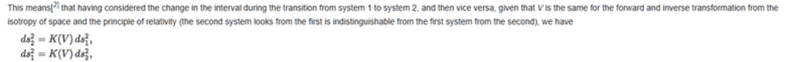 2. From 2nd inertial frame we can see 1st inertial frame but we can't conclude that ##{ds_1}^2=k(V){ds_2}^2## because initially we agree to consider 2nd inertial frame relatively to 1st inertial frame and not 1st relatively to 2nd.