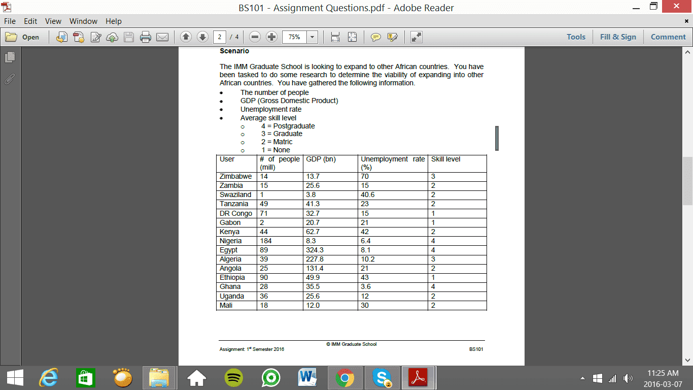 "Based on the research done in African countries, 66.67% of the sample taken of the average skills level of people between the age of 16 and 30 is a matric certificate or no formal education.