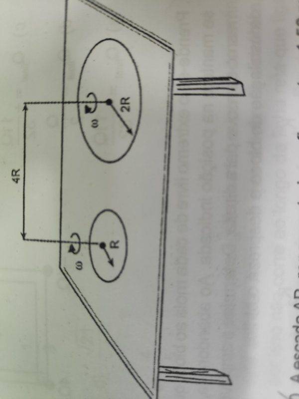- There are two discks rotating with angular velocity w and with radius R and 2R. The distance from there centres is 4R. Find the probability of a particle, that was rotating on the board of the smaller disck, to shock with the bigger after it leaves de disck.