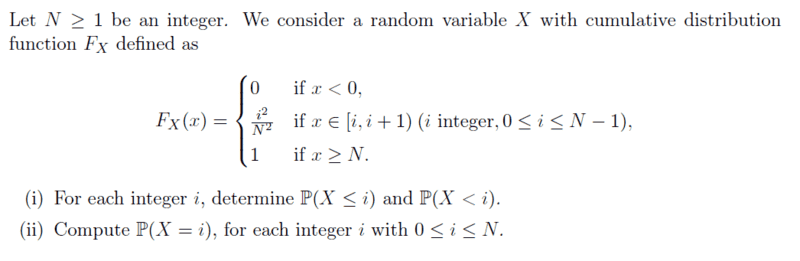 - Participants discuss the calculations of probabilities P(X ≤ i), P(X < i), and P(X = i) based on the graph of the CDF. There are attempts to clarify the implications of having multiple integers between 0 and i, and the necessity for the sum of probabilities to equal 1. Some participants question the need for piecewise functions in their answers.