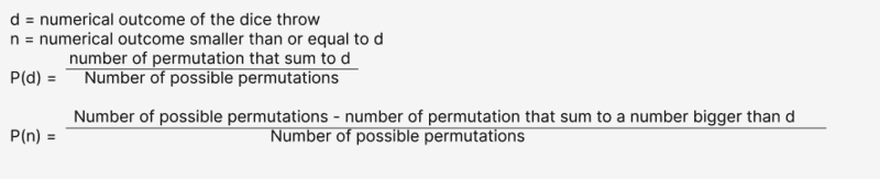 two dices have 36 possible combinations, and the likeliness of a numerical outcome Is measured by the number of combinations that sums to it, divided by all possible combinations.