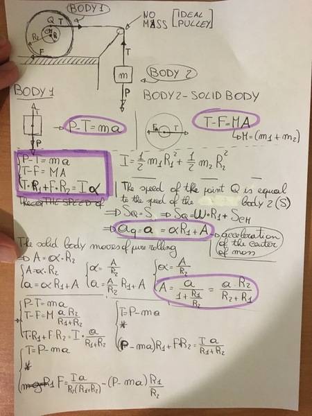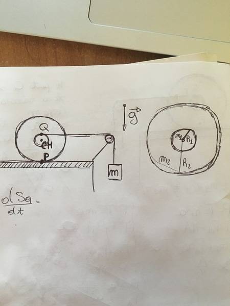 now I tried to find a relation between a and alpha: the acceleration and the speed of the piont Q has to be equal to the speed and the acceleration of the mass because the rope can't extend. So SQ=w*r1+Scm and a=aQ=alpha*r1+A (indeed I don't know if SQ=w*r1+Scm or simply SQ=w*r1 in fact, in the solution of the problem I found that SQ=w*(r1+r2) but it has chosen the point P as pole for the momentum on the forces which ita speed is istant by istant naught). Since the body rolls without slither, the acceleration A of the center of mass and alpha must satisfy the condition A=alpha*r2.