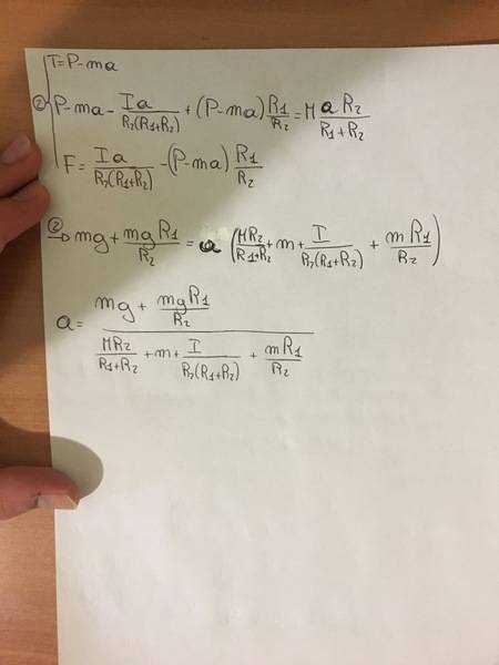 A solid body consisting in two concentric disks of masses m1, m2 and radius r1<r2 is linked through a ideal rope to a mass m which falls down with a certain acceleration. The solid body moves of pure rolling.
