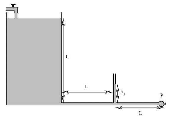 A tank contains an incompressible liquid of density ##\rho = 1. 4\cdot10^{3}kg / m^3 ## and viscosity ##\eta=1. 4\cdot10^{-3} Pa\cdot s##. The tank is open at the summit and the level of the liquid is kept constant through a sink. At the base of the tank there is a circular pipe, negligible compared to that of the tank, of radius ##r = 0.5 cm## and length ##2L##, ##L = 98 cm##. At the midpoint of a pipe there is a free air vertical manometer that shows a vertical height of the liquid of ##h_1 = 8 cm##.