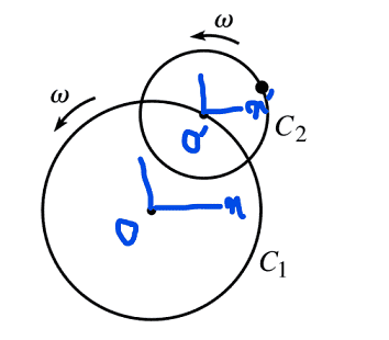 - Consider two circles(in a plane) rotating with a constant angular velocity, ω, relative to an inertial reference frame. The center of one circle is fixed at the origin of this reference frame, while the center of the second circle is located on the circumference of the first circle. If there is a point mass located on the second circle, what would be the fictitious force acting on it? The position vector of the point mass is ##\vec R(t)## in C1 circle.
