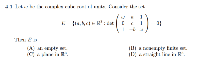 The discussion revolves around a problem involving complex numbers and determinants, specifically focusing on the equation w^2 + w + 1 = 0, where w represents the cube root of unity. Participants are examining the conditions under which a determinant equals zero and the implications of that condition.