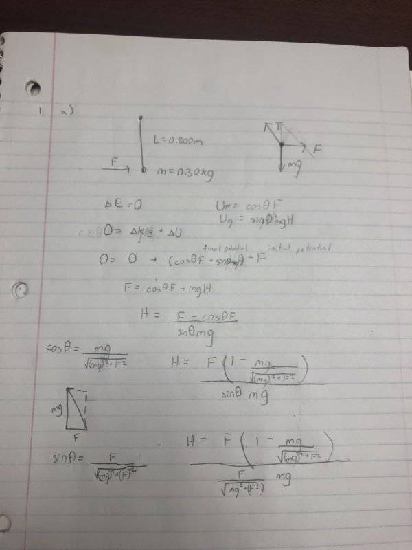 At this point in the semester we have gone over Newton’s laws of motion along with multiple energy theorems (kinetic-work, mehcanical, potential,etc.). My professor has hinted at using Newton’s laws (even though this question is in the energy chapters) but I don’t know where to derive a formula that would include both H and F, while somehow ignoring a (angle of rod’s final position and starting position) or the distance covered by the force of the wind. Thanks in advance!