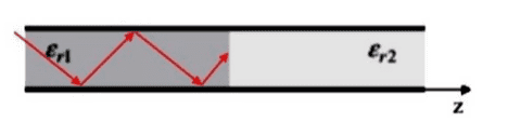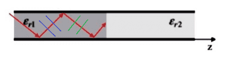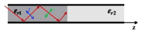 The red line can be thought of as a ray that reflects back and forth between the conducting plates. We can add wavefronts as shown below: