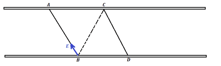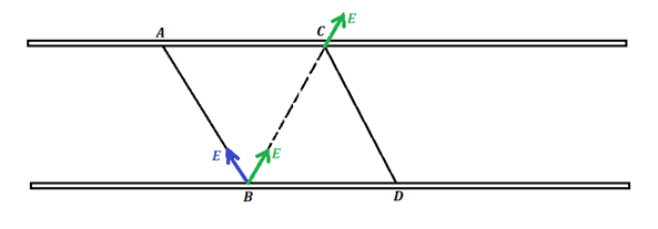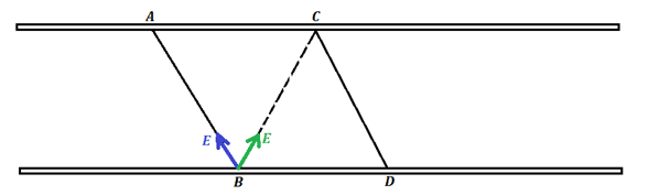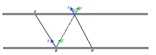 Line AB represents the edge view of an imaginary plane that extends into and out of the page and it is oriented parallel to blue wavefronts. This plane is assumed to be fixed relative to the plates and does not move with the waves. Likewise, BC is the edge view of a fixed plane oriented parallel to green wavefronts. Suppose that at some instant of time, the blue electric field at B is as shown. Then the green E-field at point B must point along the dotted line BC such that its horizontal component cancels the horizontal component of the blue E-field at B. So, it must be that at this instant of time the E-fields at B look like