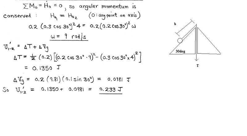 A 0.2kg ball and its supporting cord are revolving about the vertical axis on the fixed smooth conical surface with an angular velocity of 4 rad/s. The ball is held in the position b=0.3m by the tension T in the cord. If the distance b is reduced to the constant value of 0.2m by increasing the tension T in the cord, compute the new angular velocity w and the work done on the system by T.