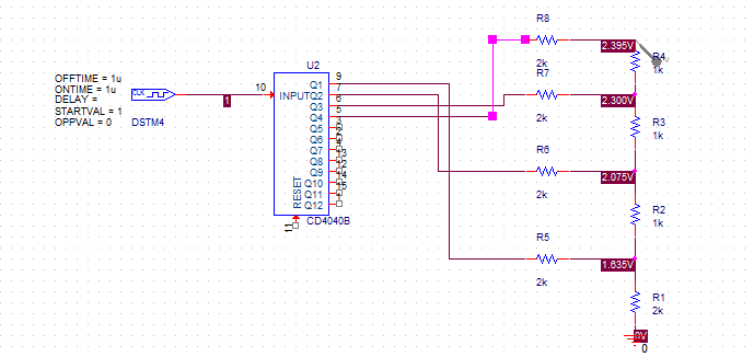 Participants note limitations in the visibility of power pins in the PSpice model and the need for proper voltage levels for the CD4040 to function correctly. There are unresolved questions regarding the output voltage levels and the appropriate setup for the DAC circuit.