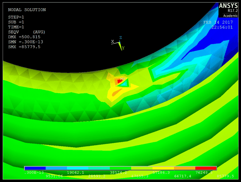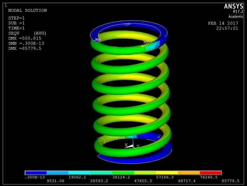 could you help me with my parametric model please? I have a problem with the end of spring. At the end of load (displacement) is problem with solve stress because there is concentrated stress and it shouldn't be. I didn't define contact between coils yet. I need to repair this fail at first. So if you could help me with to solve this problem it will be fine.